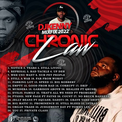 CHRONIC LAW MIXFIX 1LAWBOSS BY DJ KENNY 1. Notice 2. Tears 3. Still Living 4. Reprisal 5. Bad Tackle 6. Up deh 7. Weh unu want 8. Nuh pet people 9. Still a war 10. Far from worst 11. Parking lot 12. Speed 13. Big robbery 14. Empty 15. Good from bad 16. Corrupt 17. Drip 18. Murdera 19. Garrison above 20. Realize ft Qrush 21. Evil 22. Family 23. That's all we need ft Prohgres 24. PTSD 25. New page ft Payne 26. Count 27. No bruck badness 28. Jelly beans ft Squash, Daddy1 29. Grave yard shift 30. Big matic 31. Prominence 32. Still bleed 33. 1strap 34. Organ trade 35. Judgement day ft Tommy Lee 36. You 37. Private class THIS MIXTAPE IS ONLY FOR PROMOTIONAL PURPOSE NO COPYRIGHT INTENDED.©